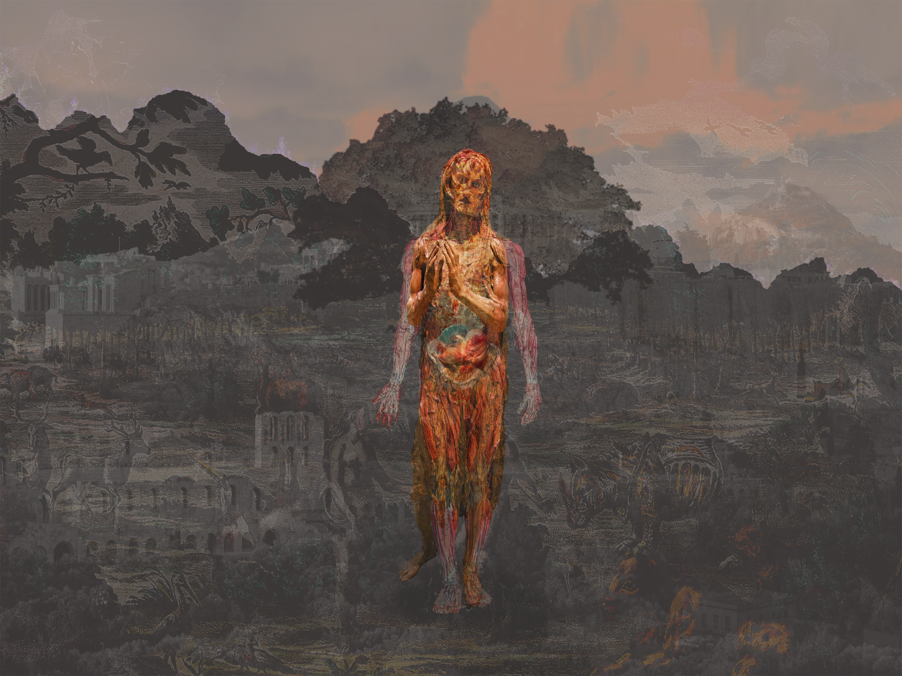 I was wandering without no goal in a deserted and devastated land, and suddenly I met a figure reaching the hands towards me. The figure was not asking for help, just asking for pity, empathy for its sufferance and anguish, having ben left alone in this desert, tormented by violence and war.