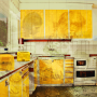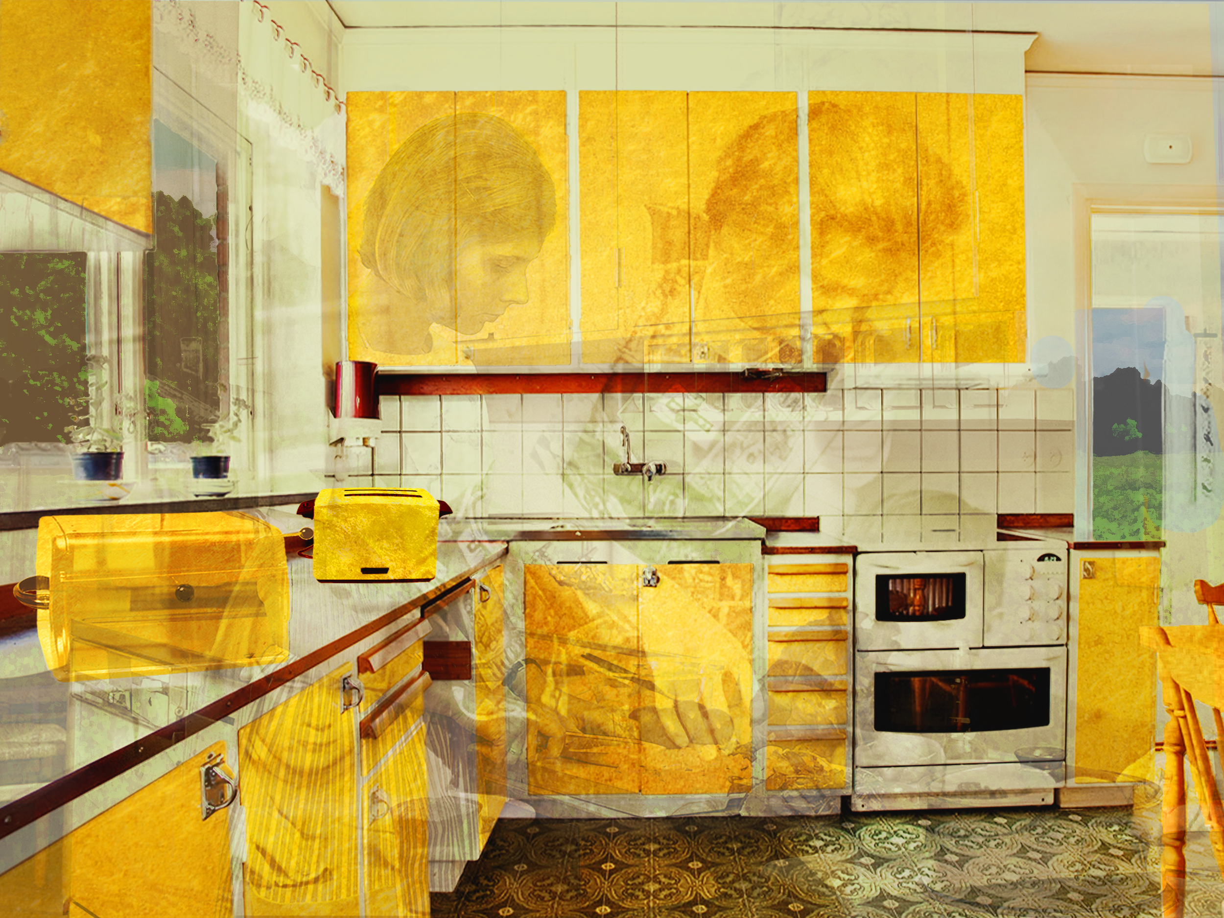 Det här är en bild inspirerad av min barndom. Jag växte upp i en stor villa i en medelklassförort till Stockholm, och vi hade ett typiskt kök från 60-talet - funktionellt, gult och trevligt. Min mamma lagade alltid mat, och utanför fanns fruktträd i en stor trädgård. Det var på ett sätt en gyllene period i mitt liv, och jag minns fortfarande alla detaljer i det köket. För mig har köksartiklarna blivit heliga och är viktiga källor till min konst. Det är därför som föremålen i köket är förgyllda, som i medeltidens ikoner.